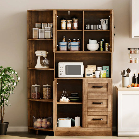 Furmax Tall Kitchen Pantry Cabinet Farmhouse Freestanding Storage Cabinet with Barn Doors, Drawers & Corner Shelves for Kitchen, Dining Room, White