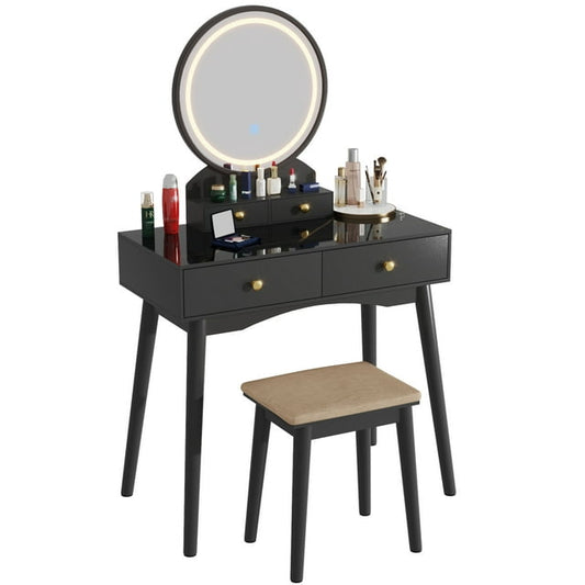Furmax Vanity Table with Lighted Mirror, Vanity Desk with Stool, Dressing Table with 4 Drawers, Makeup Vanity Set