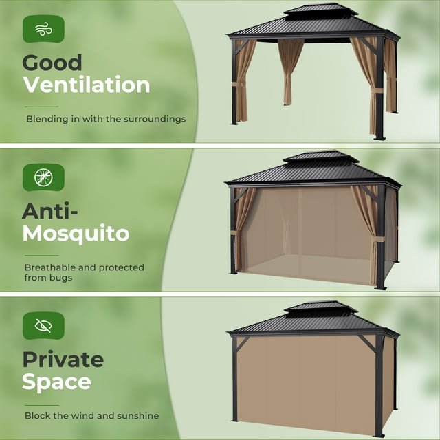 Furmax 10' x 12' Outdoor Hardtop Gazebo Galvanized Steel Metal Double Roof and Aluminum Frame with Canopy, Netting, Curtains Permanent Pergola for Patio Backyard Garden Lawns Parties