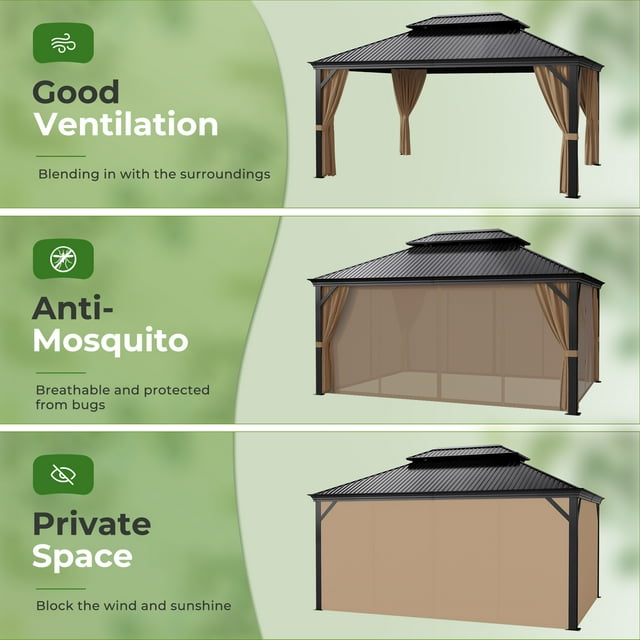 - Double Galvanized Steel Roof: Experience luxury and endurance with this exquisite gazebo featuring a double galvanized steel roof that blocks harmful UV rays while providing optimal air circulation. Its robust design withstands harsh weather conditions, and a thoughtful drainage and gutter system adds to its longevity. Elevate your lifestyle with this impeccably constructed gazebo, perfect for relaxation or entertainment in your outdoor space.