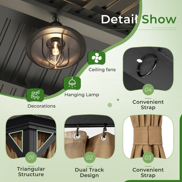 - Multiple Applications: This spacious and versatile gazebo is perfect for entertaining guests or simply relaxing in style. With the capacity to accommodate up to eight people, it features hooks for mounting fans and lights that can be adjusted to meet your specific needs. Whether you're hosting an outdoor barbecue, soaking up the sun, or enjoying everyday relaxation, this luxurious gazebo offers a comfortable and convenient space to unwind and make unforgettable memories with family and friends.
