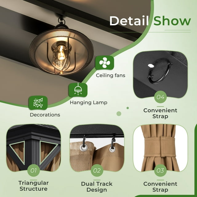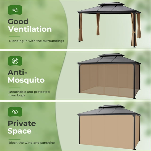 - Netting and Curtains: This outdoor gazebo features a two-track system, allowing the mosquito netting and curtains to slide independently. The removable curtains provide protection from UV rays and rain, while the mesh mosquito net with zipper increases ventilation. Enjoy privacy with an open view of the outdoors and ample air circulation - perfect for relaxing while staying protected from the elements.