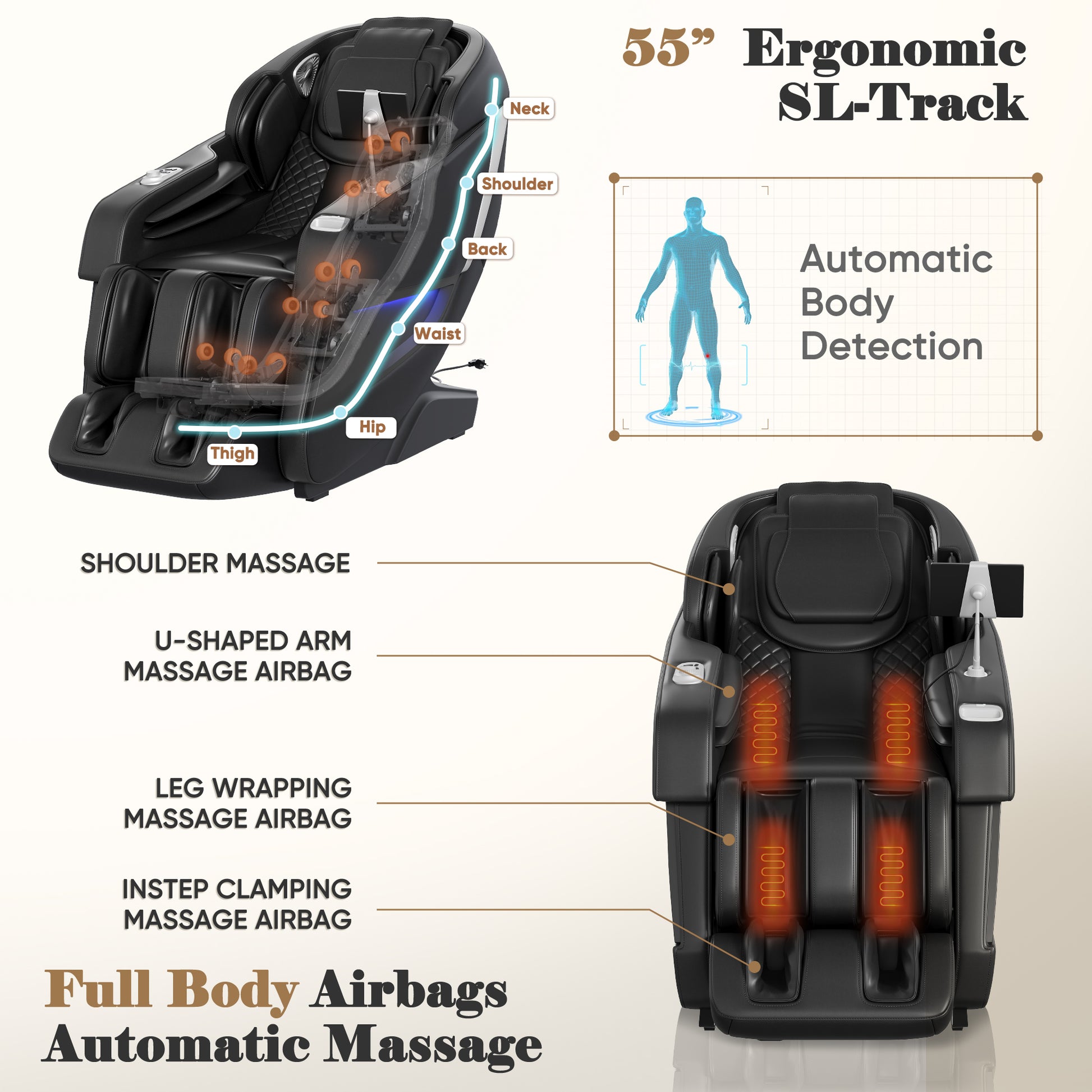 32 airbags + 3D sensors automatically detect height and body shape, adjusting air pressure and roller paths to target shoulders, back, and hips with custom Shiatsu precision. -