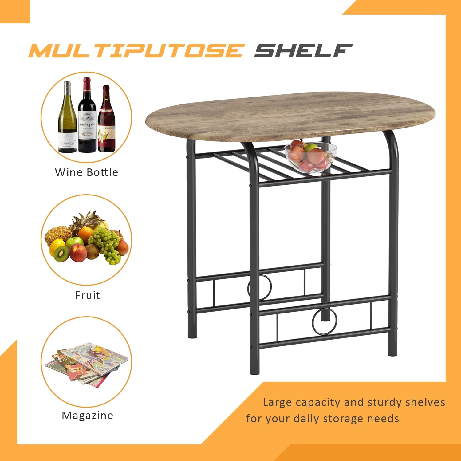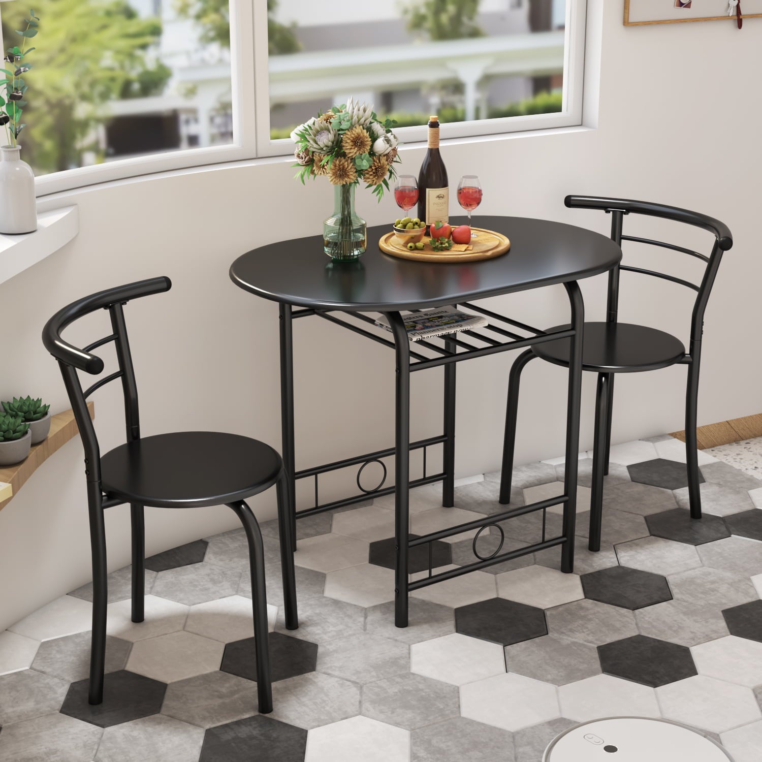 This 3-piece table and chair set is the perfect addition to tight spaces. Equipped with a sturdy table and seating for 2 people, with space underneath for wine, magazines, glasses, bowls, and most importantly, the curved shape fits perfectly with the edge of the table, so when not in use, the two chairs and a table can be combined into one, saving space, it is your ideal furniture choice.