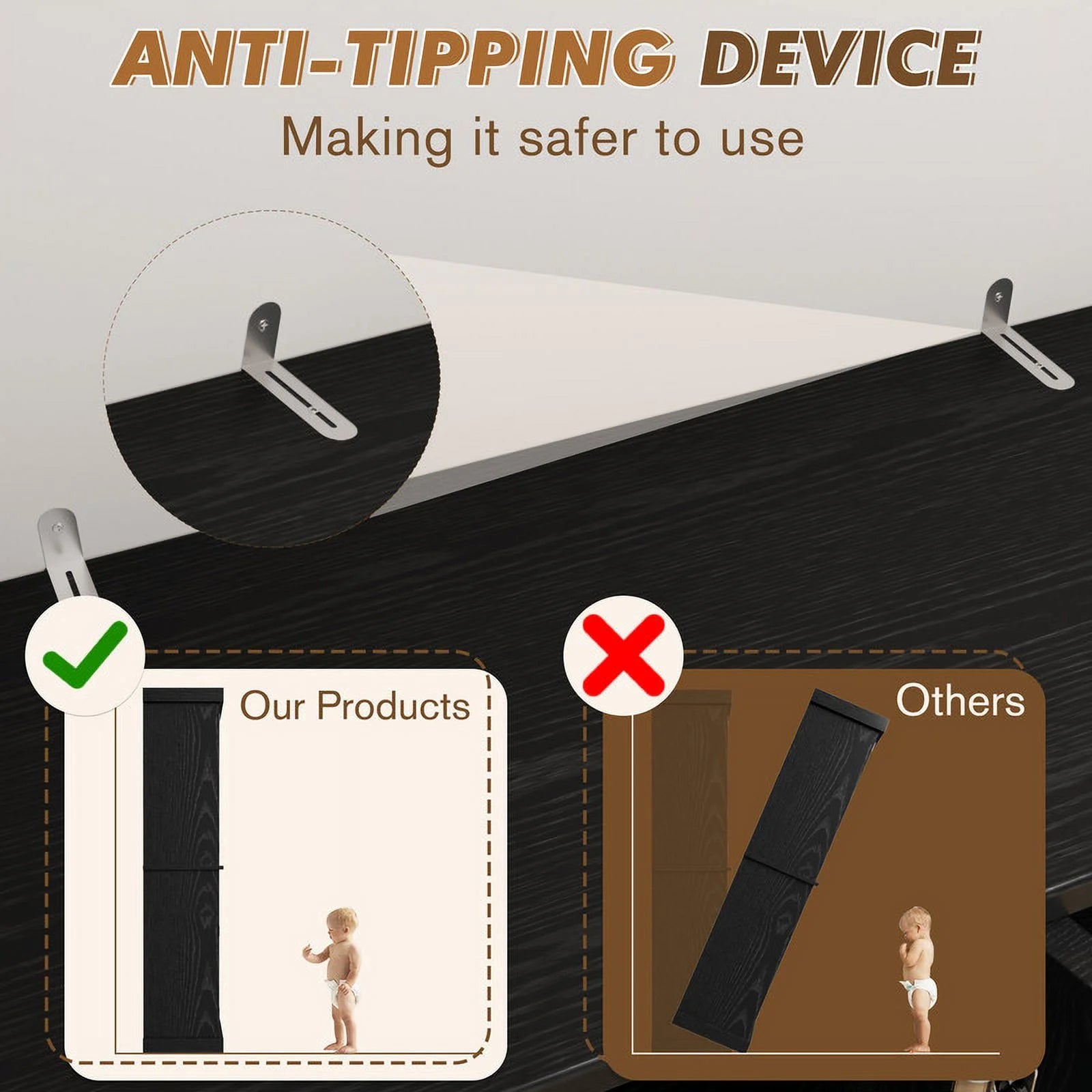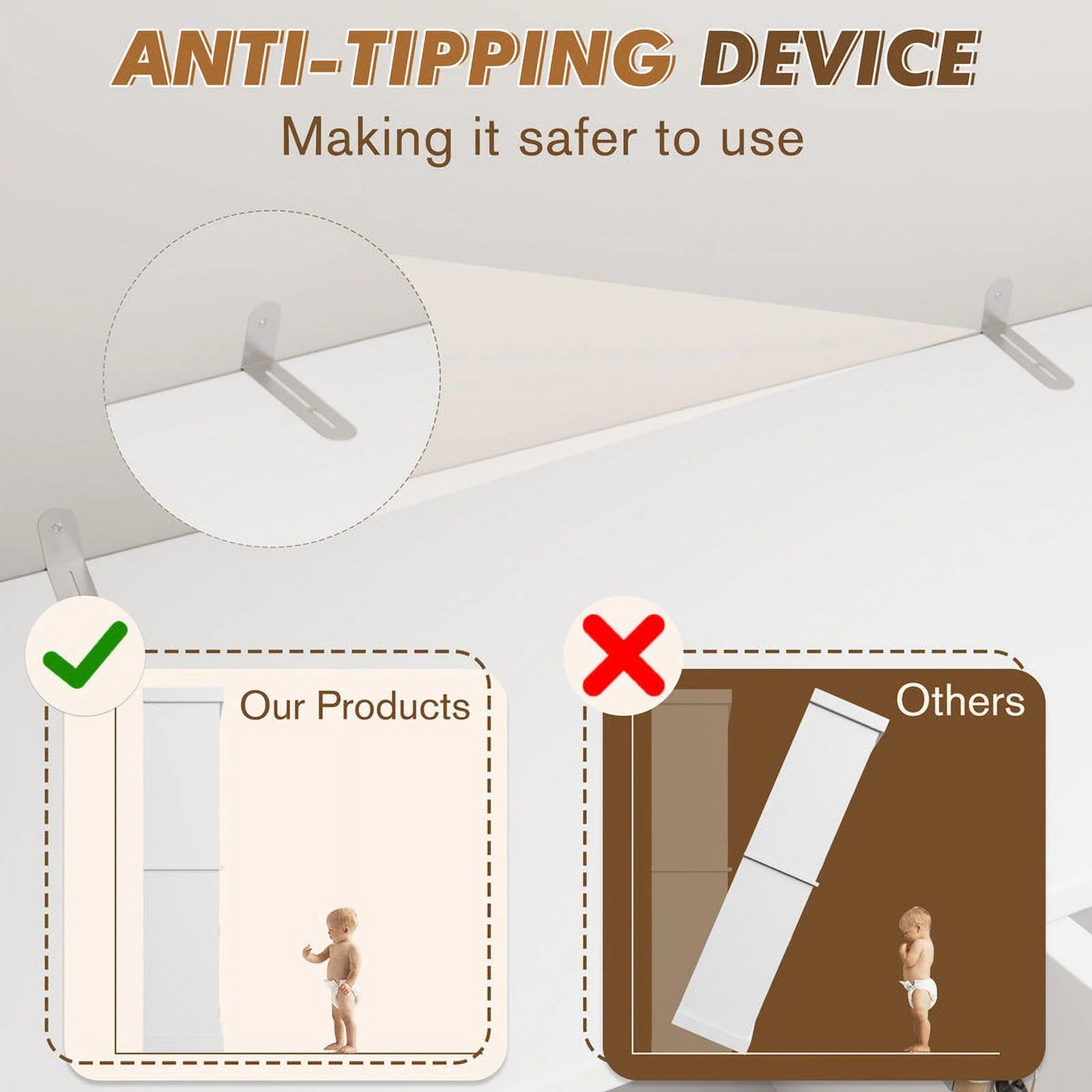 Safety Features Included: The included anti-tipping kit ensures the cabinet is securely anchored to the wall, providing peace of mind and enhanced stability.