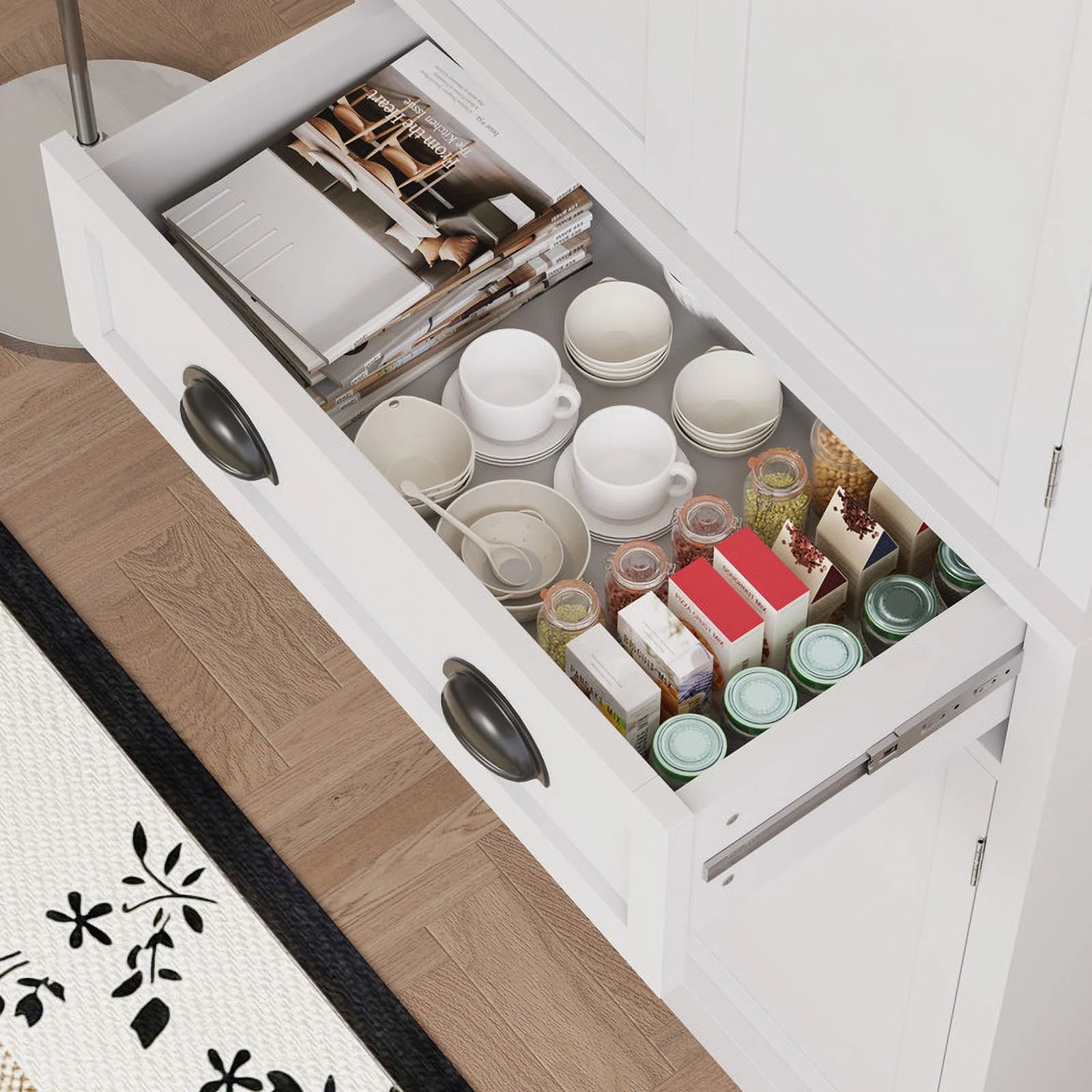 Elegant & Versatile Design: Its sleek lines, neutral color palette, and beaded cabinet doors give it a timeless appeal that suits any kitchen, dining room, office, or living room.