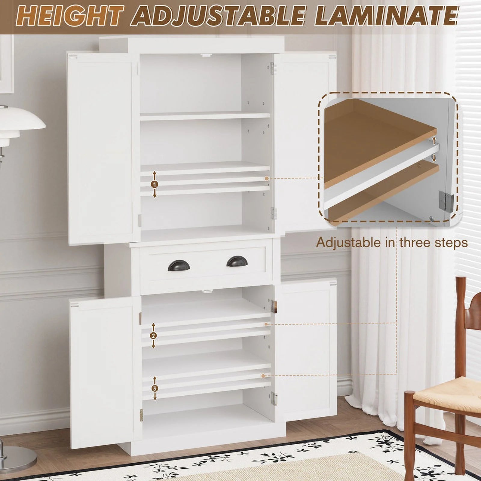 Massive Storage Capacity: The Furmax Kitchen Storage Cabinet features 2 spacious double door cabinets and multiple adjustable shelves, providing ample room to store kitchenware, canned food, beverages, and more.