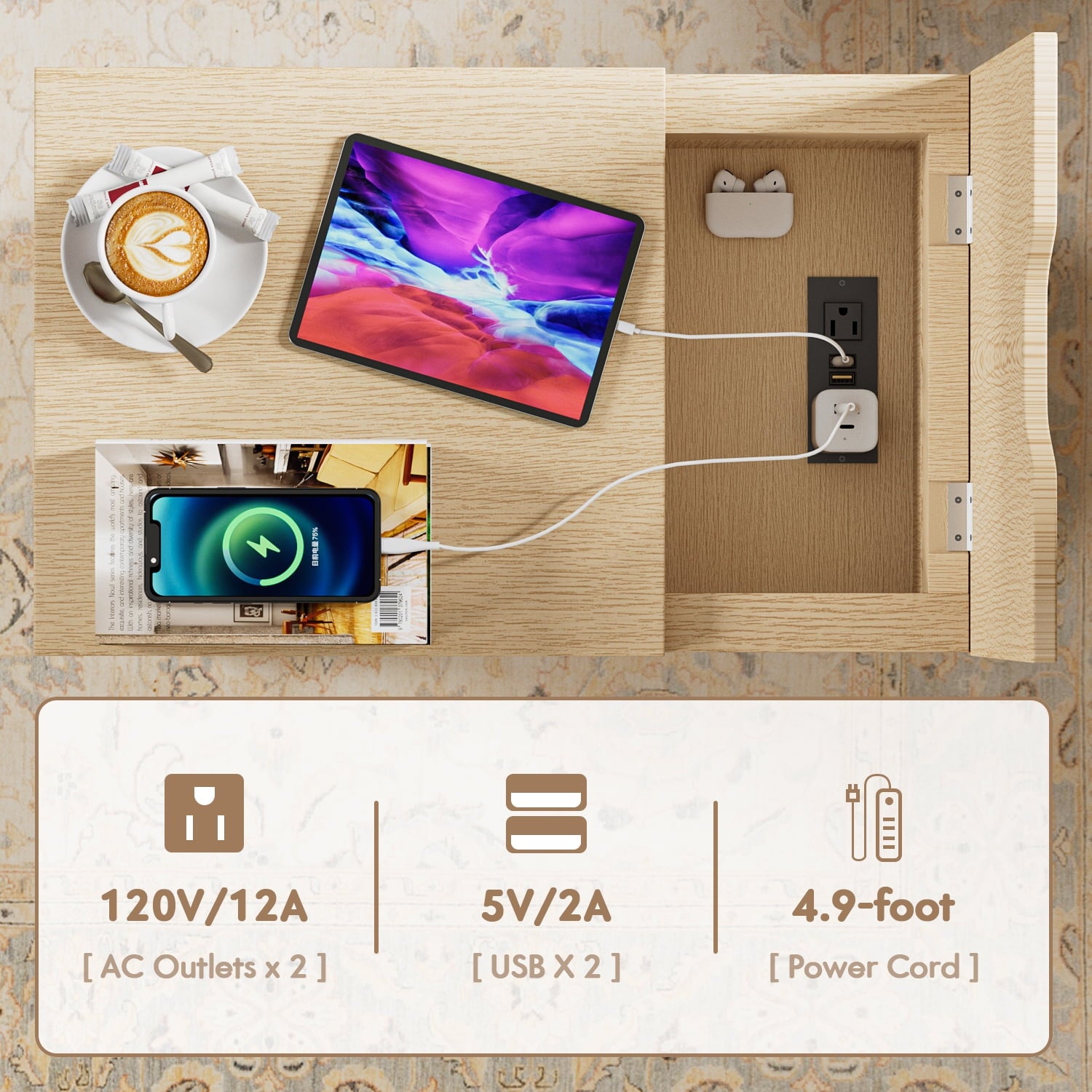 - Easy to charge: This end table has 2 USB ports and 2 3-prong power outlets to power your lamp, tablet, phone, laptop, etc. at the same time. In addition, the 4.9-foot power cord provides enough distance that you can place the side table at multiple angles.