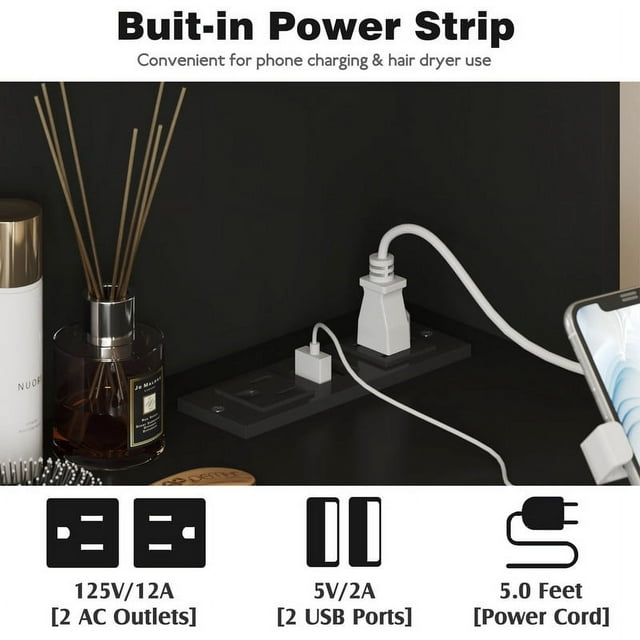 - Built-in Charging Station: This vanity table with 2 standard plug sockets and 2 USB ports, more convenient for curling iron, beauty device, hair dryer and phone charging.