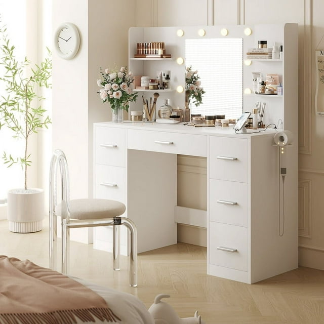 - Plenty of Storage: Large table top with 7 Drawers and 6 open storage space, all of your makeup, hair and body products can fit and keeps them stored and safe.