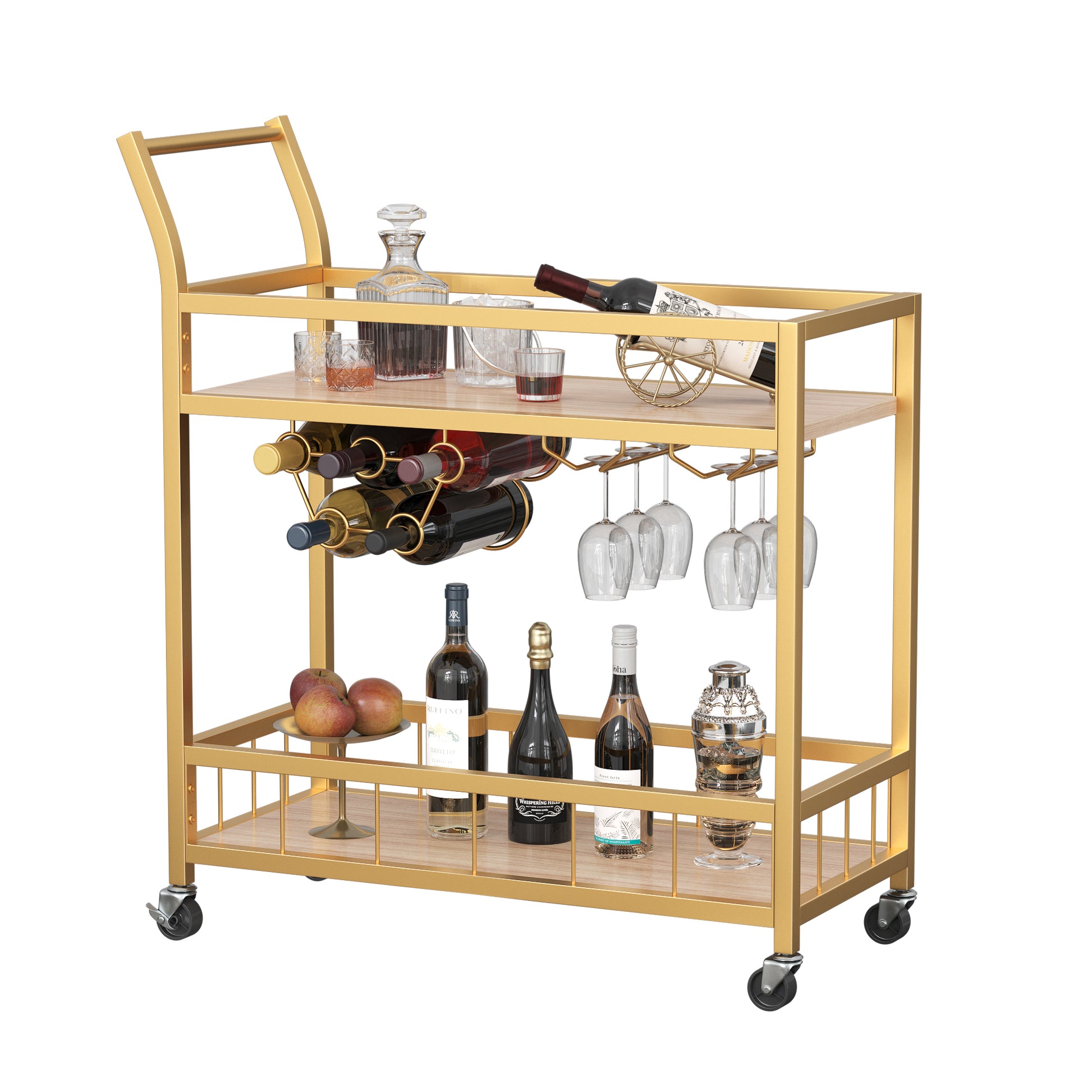 Furmax Mobile Bar Cart, Modern, Industrial, With Wine Rack, Glass Holder, and Wood Storage Shelves, Ideal for Living Room, Kitchen, Bar, Restaurants, and Parties, Golden