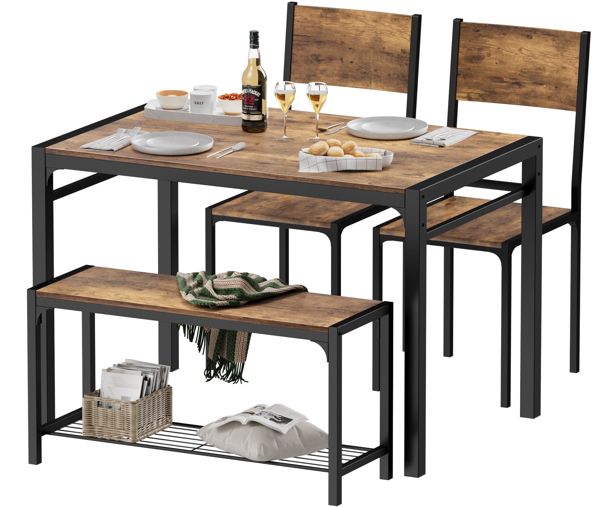 - 【Space Saving Design】The table is designed to easily accommodate 2 chairs and a bench underneath. When not in use, you can conveniently slide them under the table to save space.