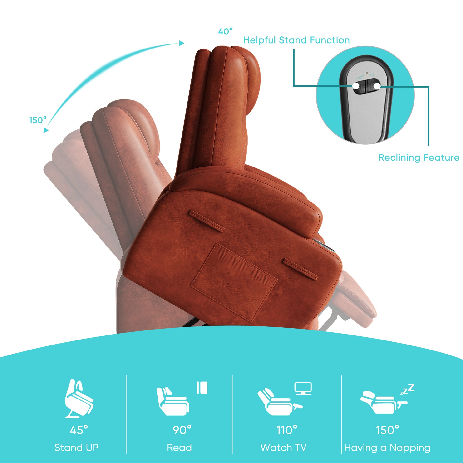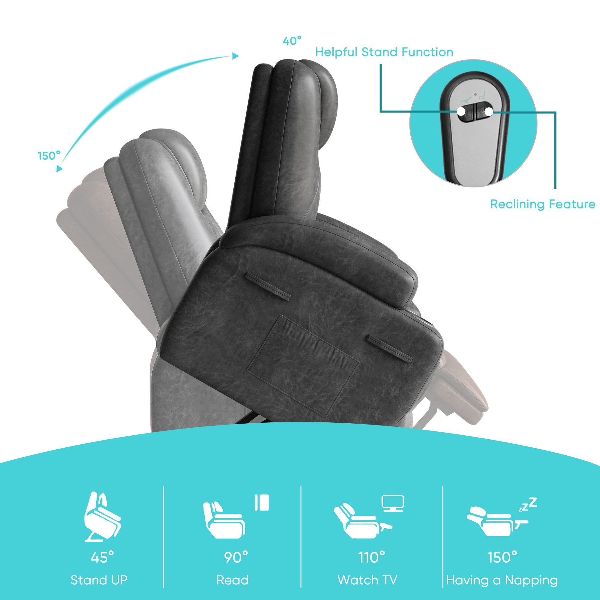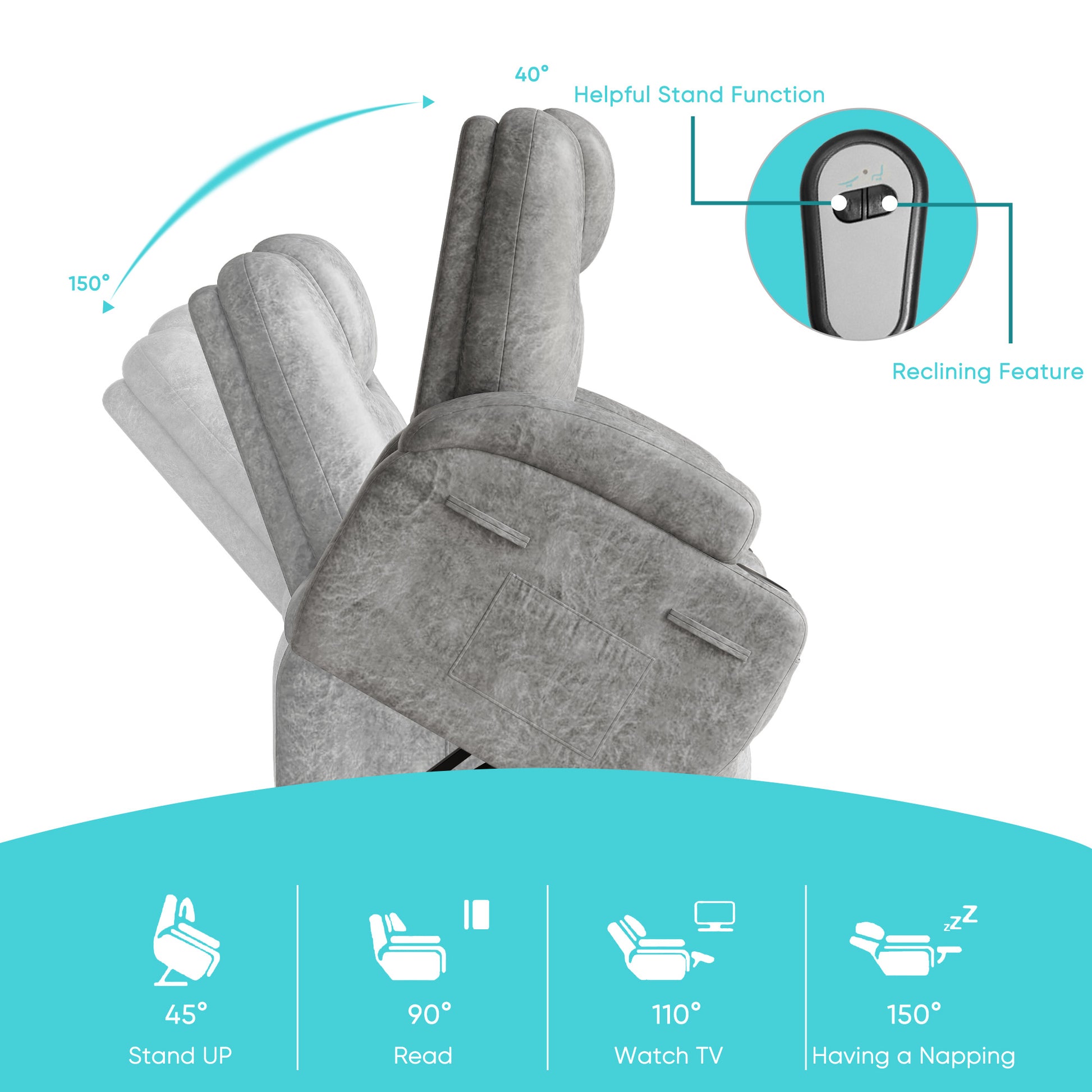 - š”ćPower Lift AssistancećThis powerful height-adjustable recliner provides easy standing assistance. Just press a button on the remote control, and the entire seat will be smoothly and quietly lifted, effectively reducing the pressure on the back and knees. It is very friendly for families with elderly members or those who have difficulty standing. Moreover, through remote control operation, you can adjust the recliner from 45° to an almost flat 150° angle, meeting different needs such as reading, watching TV, or taking a nap.