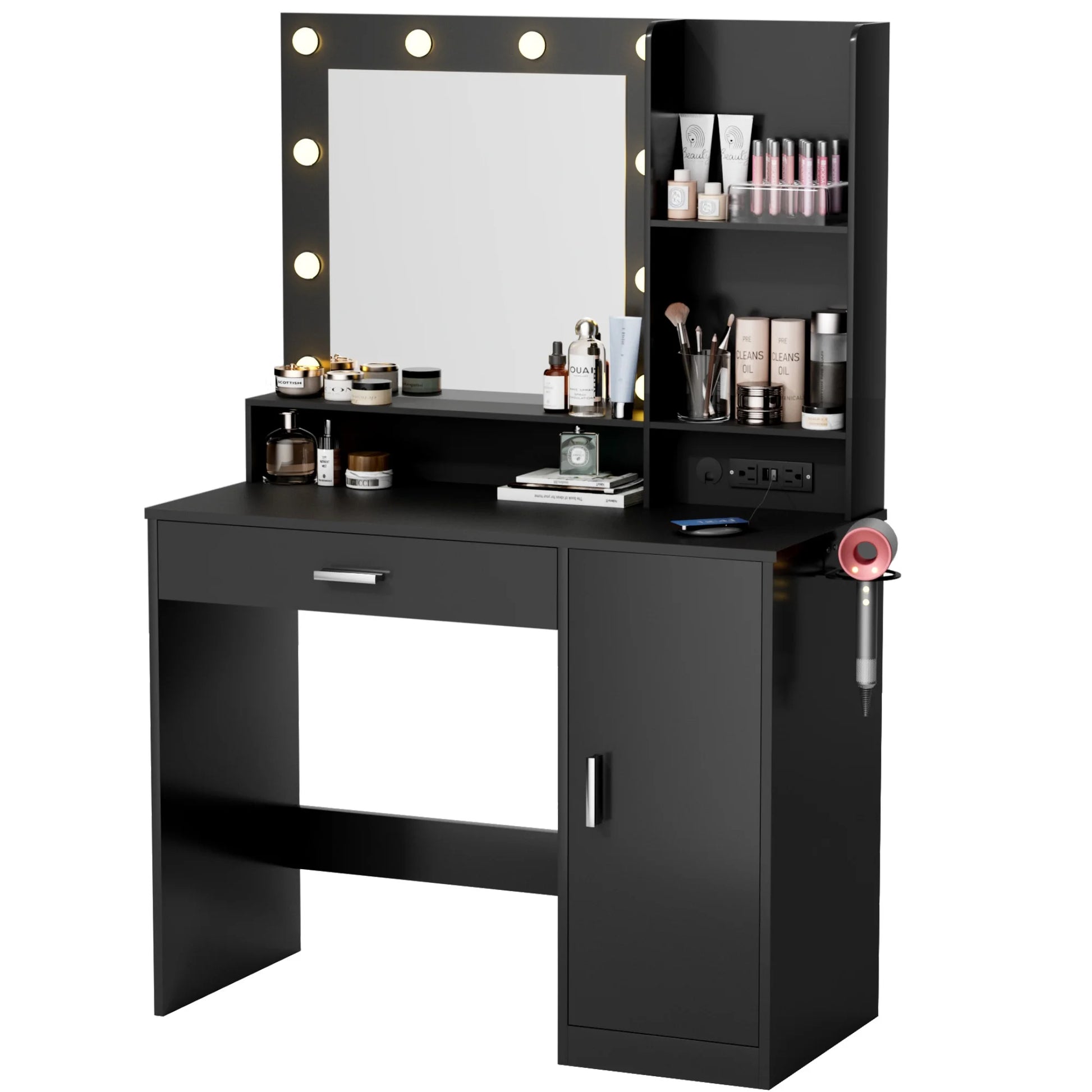 Furmax Vanity Desk with Lights and Mirror Makeup Vanity Table Set with Cabinet and Power Outlet,
